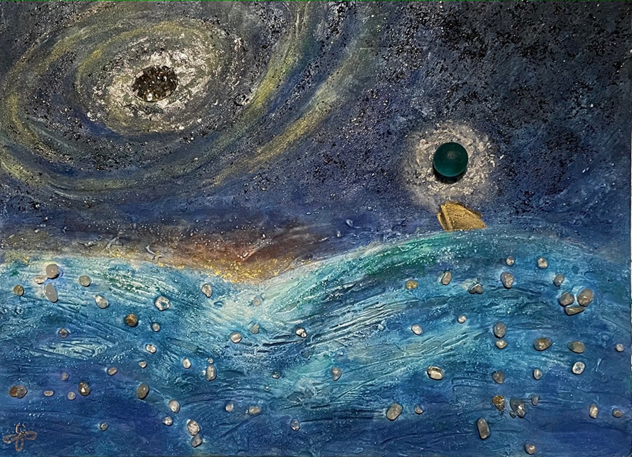 ヒーリング鉱石の粉を混ぜた盛上胡粉で立体的な下地を作った上に、様々な岩絵具を重ねました。水面にはルチルクォーツのさざれ。水平線の彼方に見える光は金箔。方舟にも金を使用して希望の光を託しました。